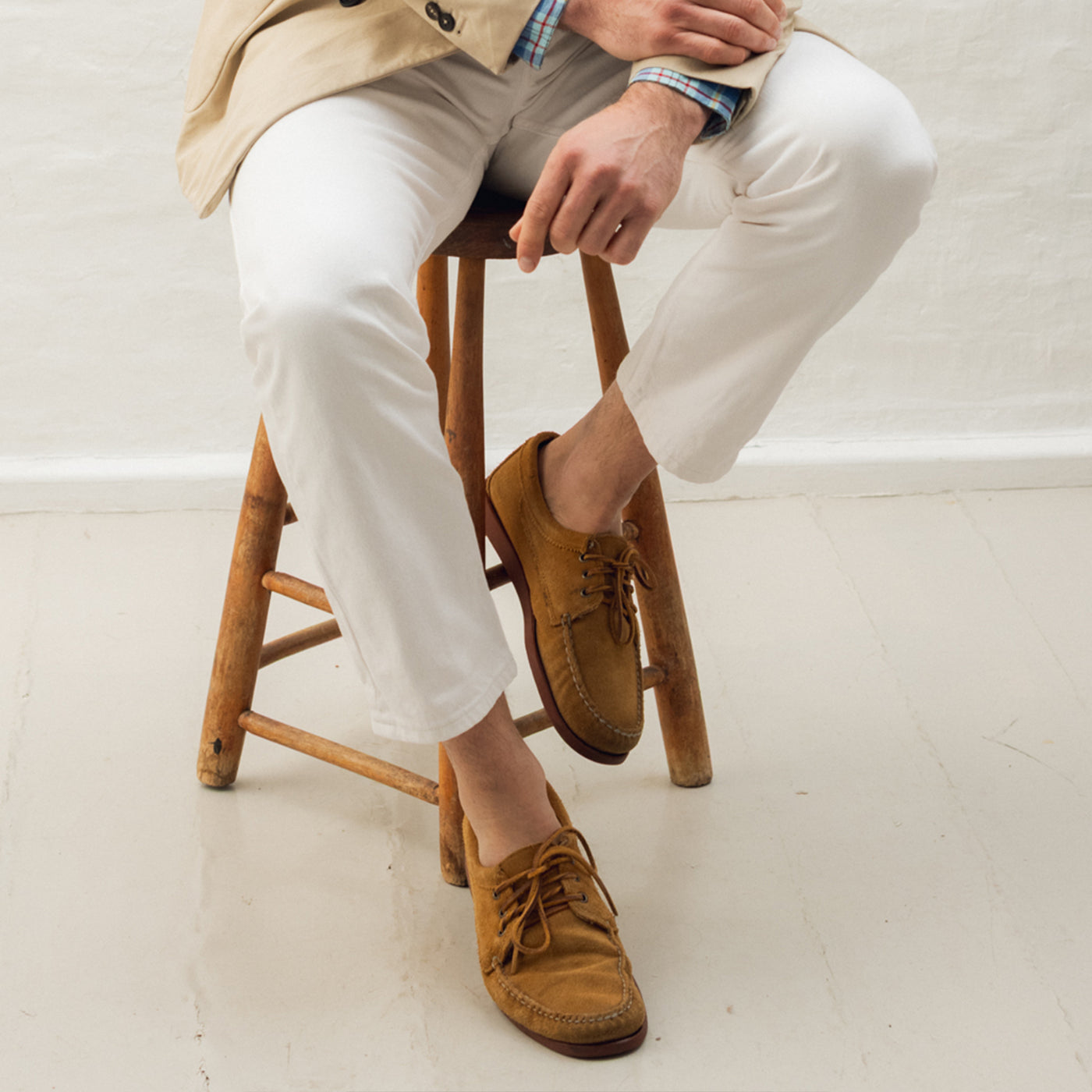 A blend of construction between a classic moccasin with a traditional blucher’s open lacing system for a shoe that cradles your foot in comfort and is easy to step into and take off.
