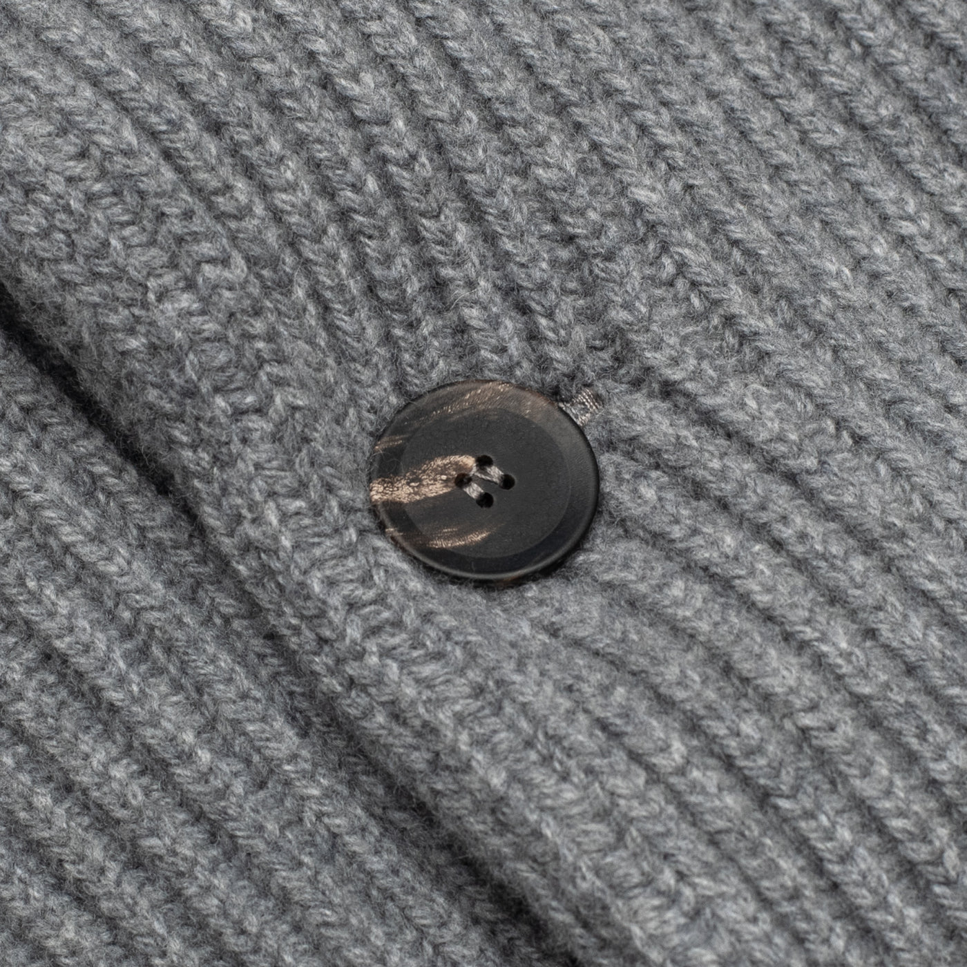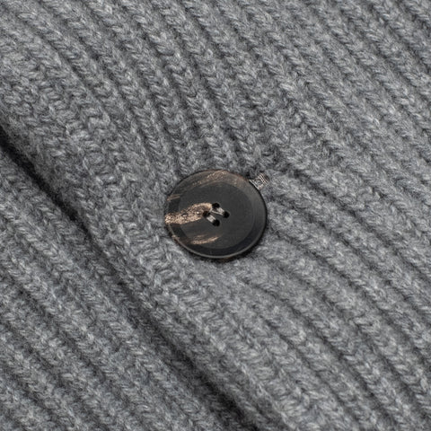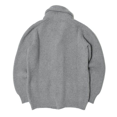 Knitted from lofty wool-cashmere yarn, it’s soft yet structured, with a ribbed knit stitch pattern for added shape and warmth whilst the shawl collar broadens the shoulders.