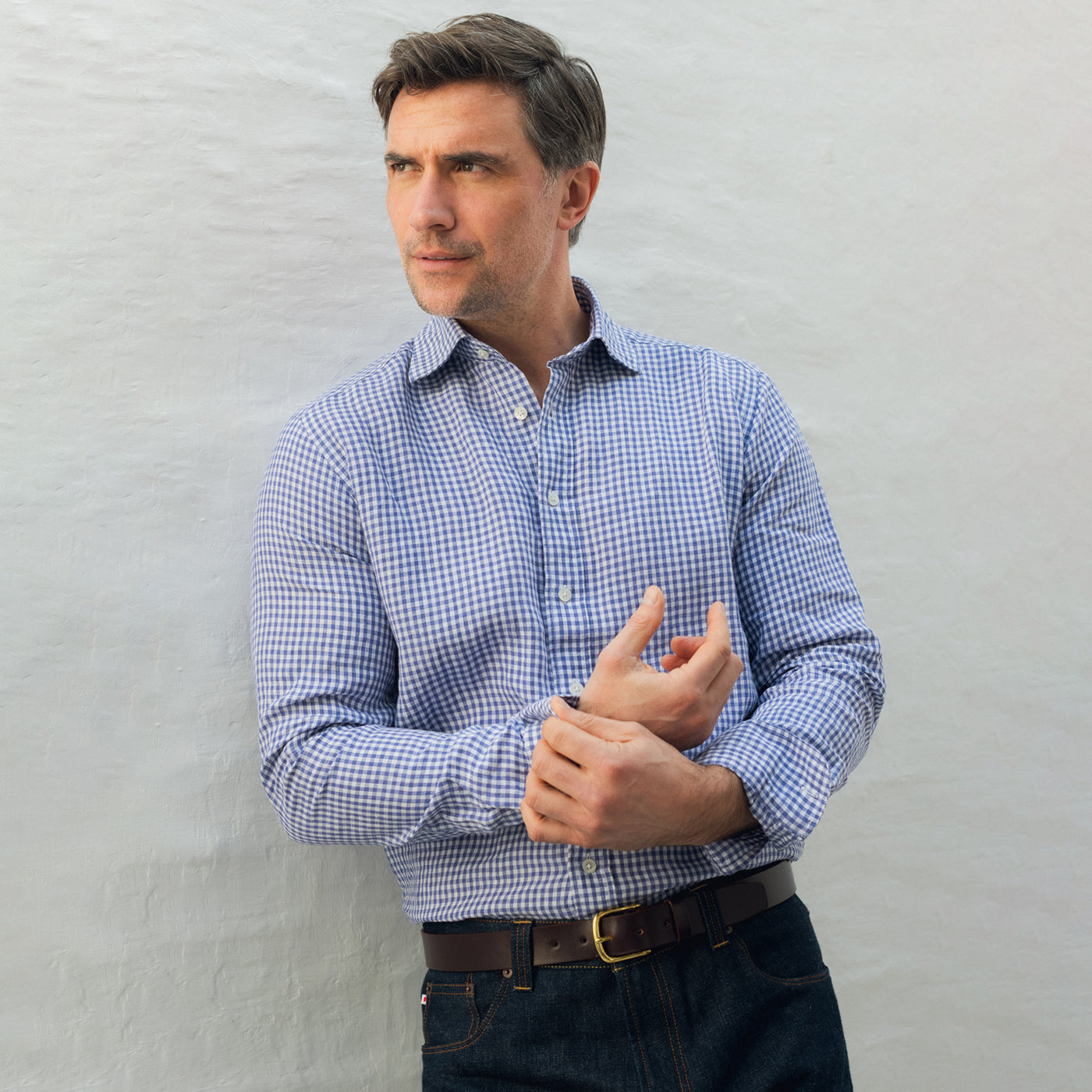 A fresh take on our perennial favourite, the Iris Blue Gingham is crisp and light. Cut for comfort with classic shirting details, featuring our soft semi spread collar, single button rounded cuffs, a gauntlet button, knife pleats, split Yoke back.