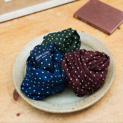 Our spot Wool/Silk scarves are screen printed by hand in Italy