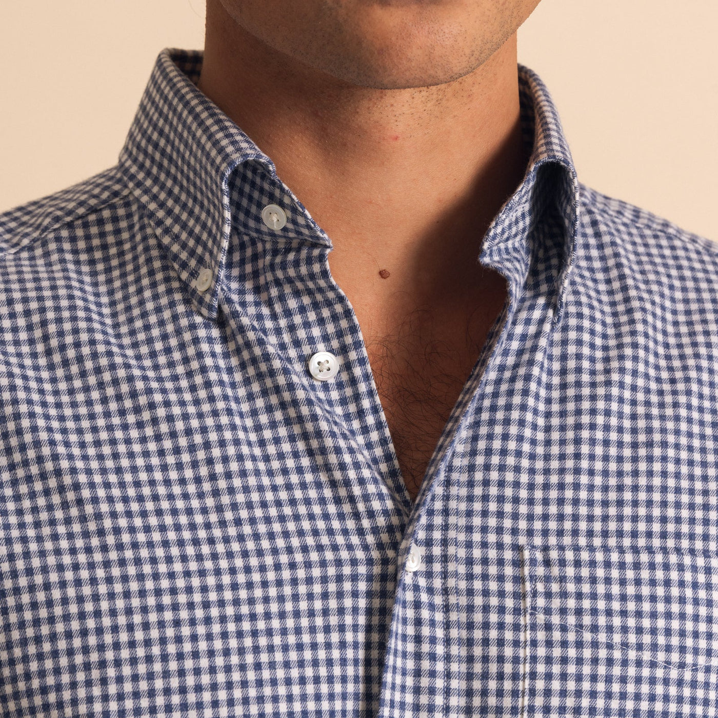 Cut with a regular fit and longer pointed collar, which provides a soft roll with a button-down collar.