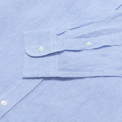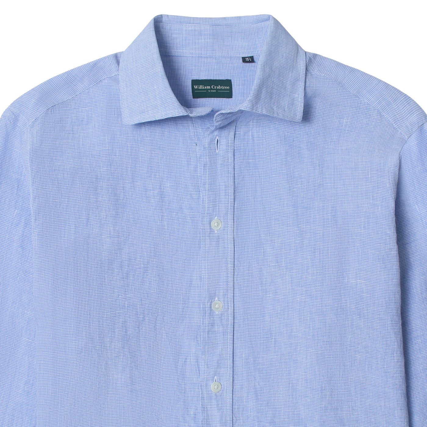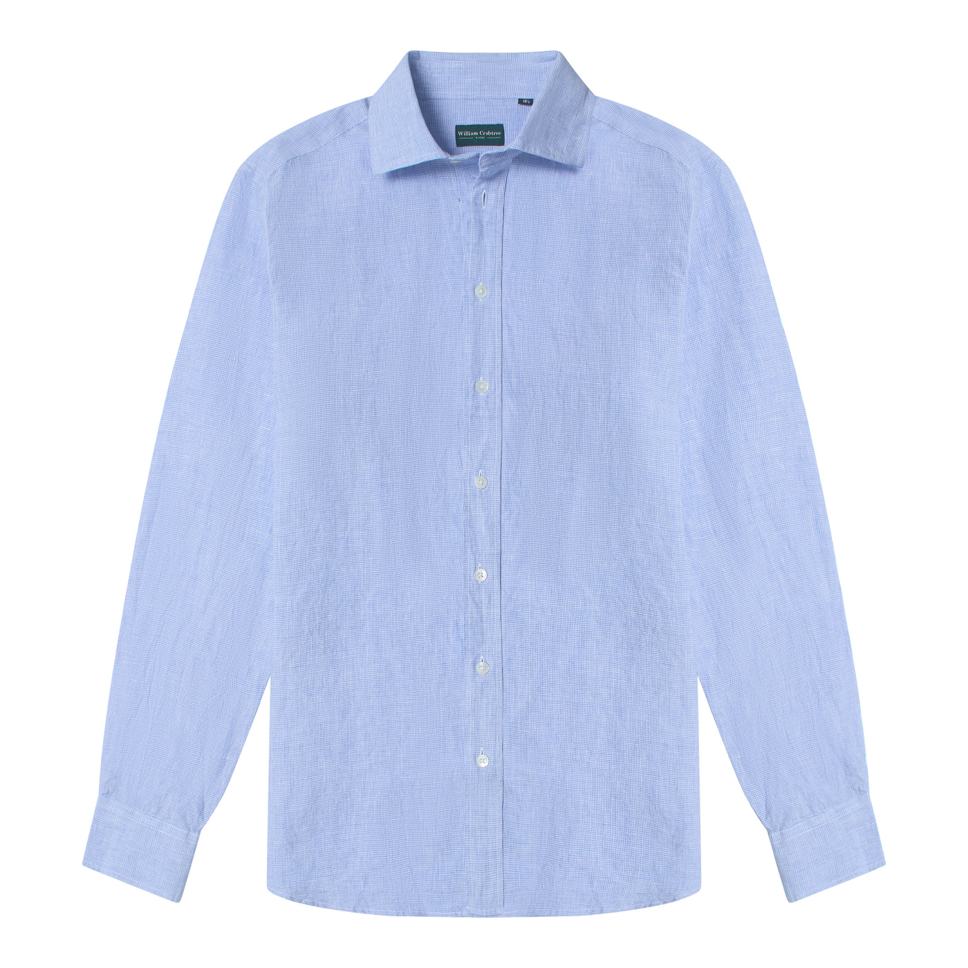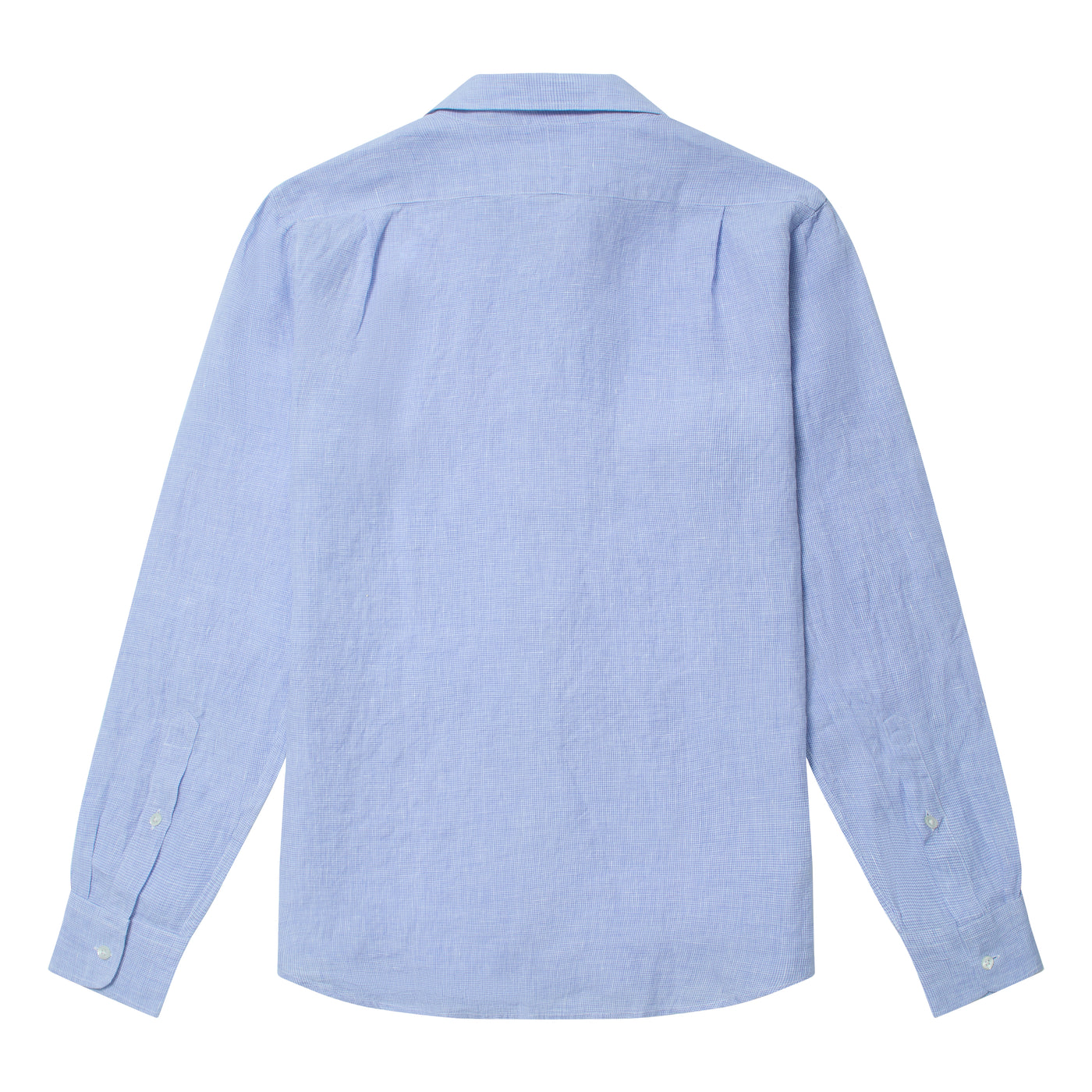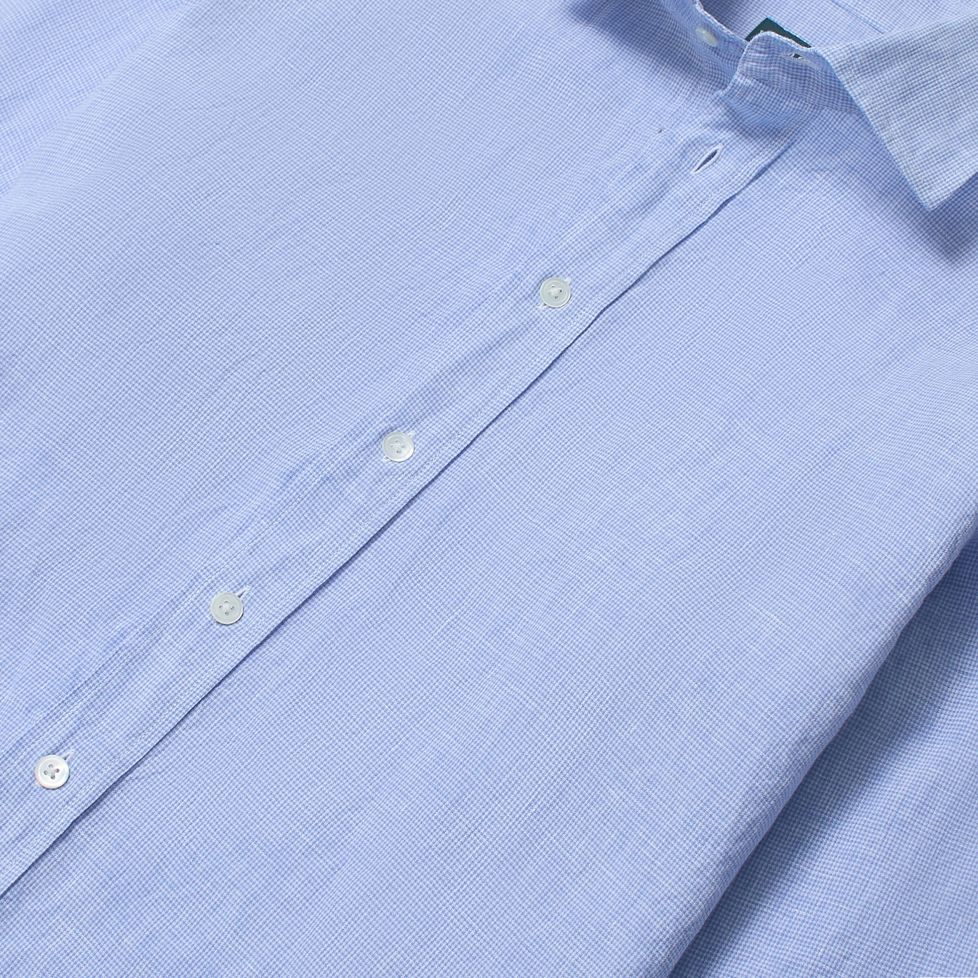 Delicate puppytooth patterning lends texture to this sky-blue linen shirt. Lightweight and versatile, it’s an effortless choice for both casual and more considered summer dressing.