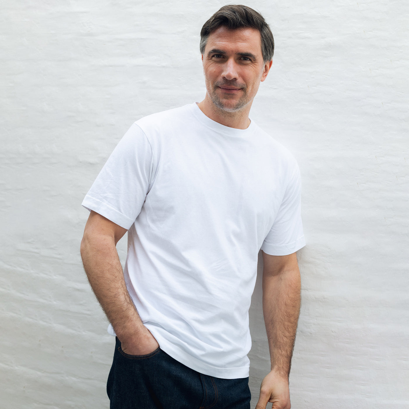 Jersey cloth knitted with tension to create a robust 190gram cloth. We feel it's the perfect white T shirt, the neck line, sleeve length and fit, all as they should be.