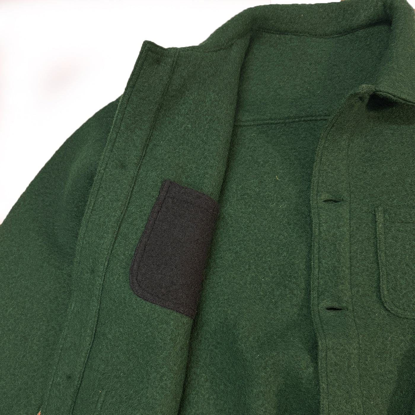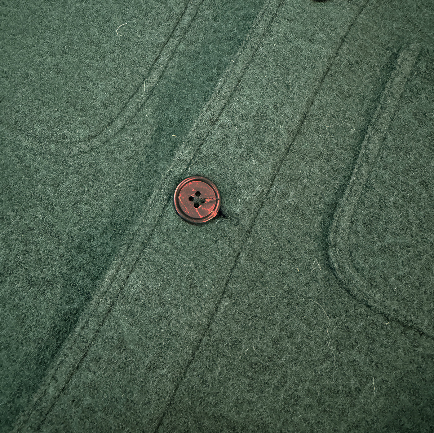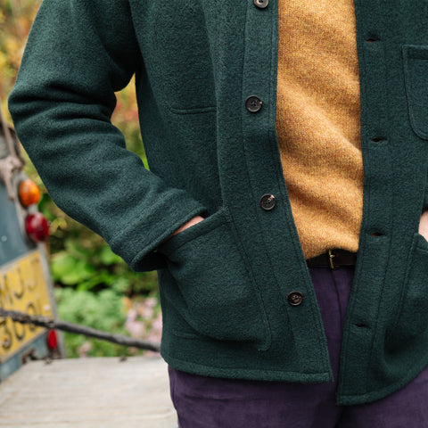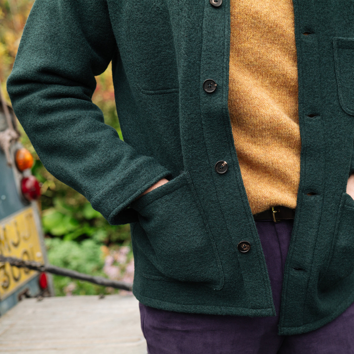 A relaxed nod towards the humble Chore jacket style, we have developed a densely woven wool and treated it to a boiling to burst the fibres and really 'mill' them together.